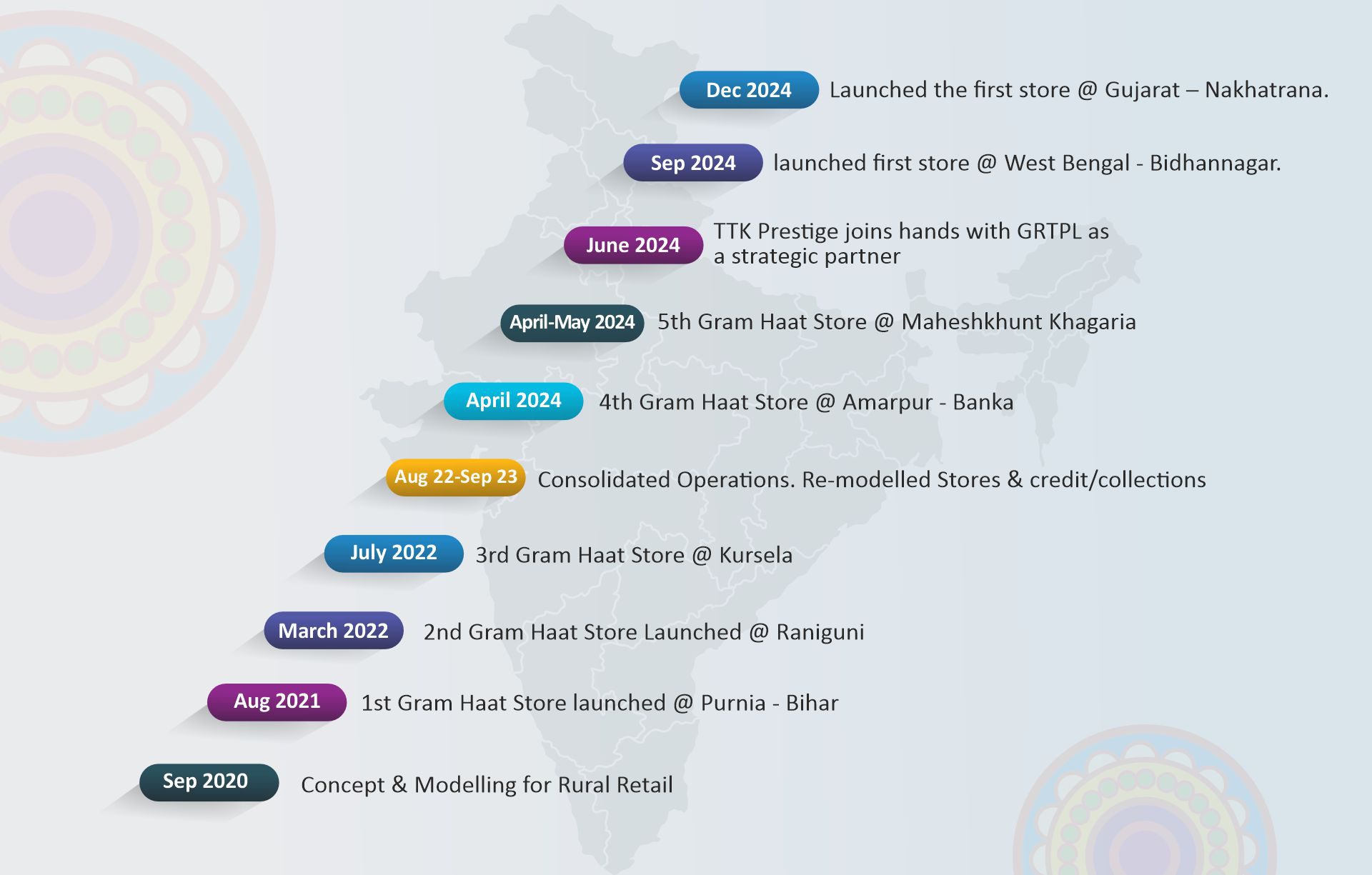 Through our network of rural retail stores aptly called "GramHaat", we offer good and services, that ​ Improve the daily lives of the a rural households. Each Gram Haat store fills the void between Rural aspirations and availability of dependable, affordable products and service.